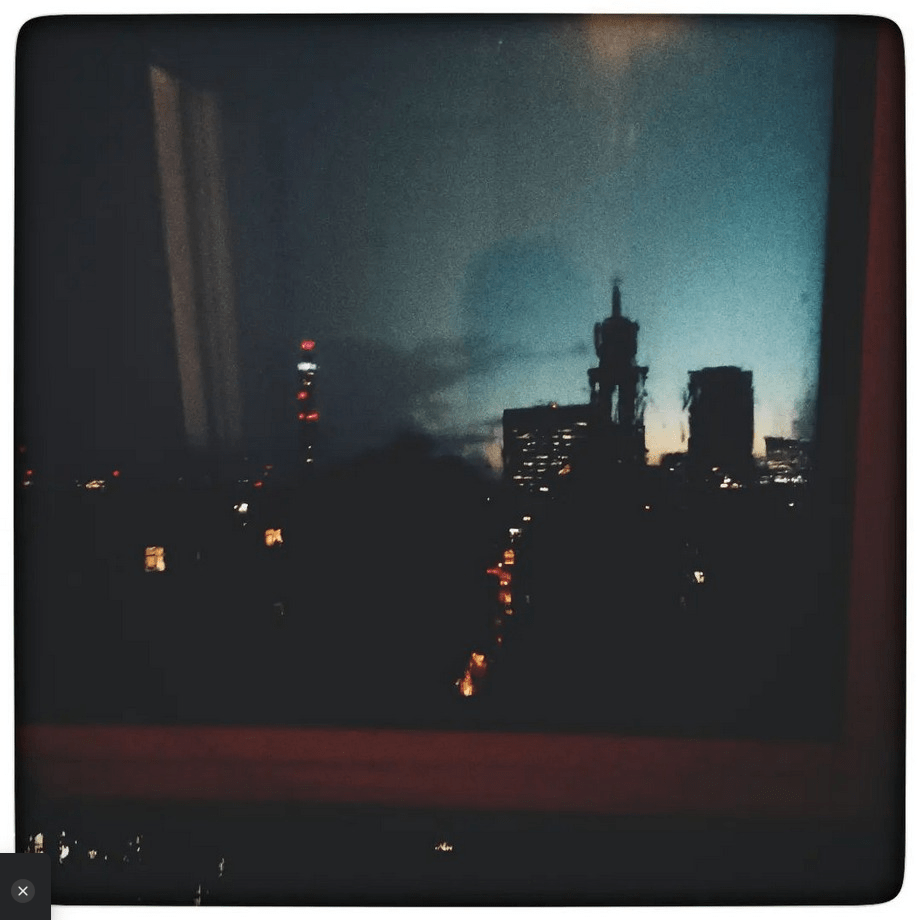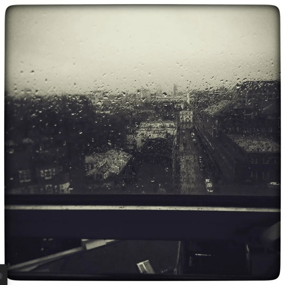 I see a sombre city outside the window.